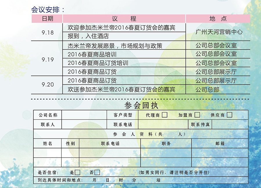此次訂貨會我們?yōu)槟鷾蕚淞?016春夏新品展示及訂貨銷售培訓,現(xiàn)場進行商品訂貨。讓您全新體驗杰米蘭帝2016春夏季產(chǎn)品,共享這場時尚“盛宴”。