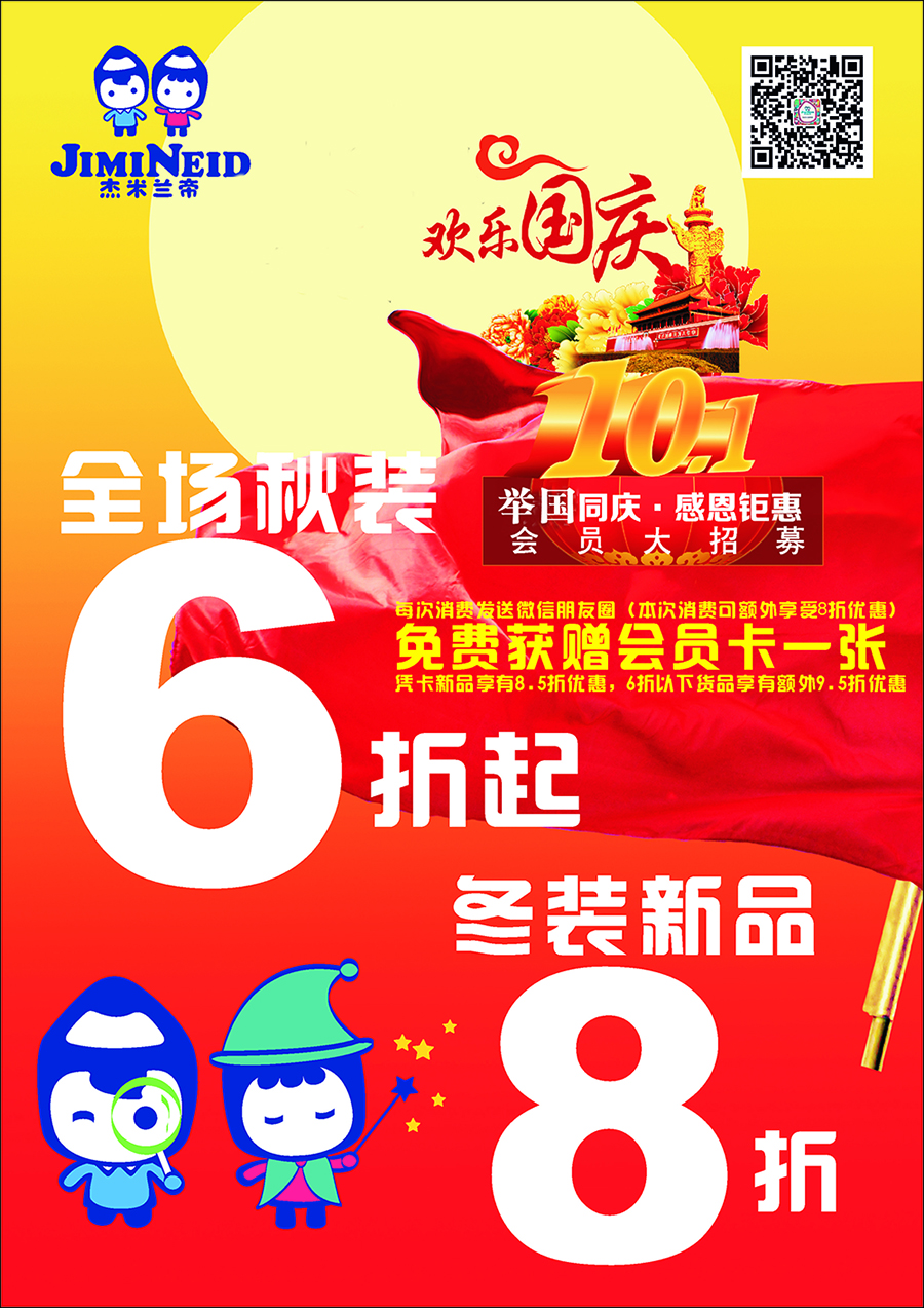 歡樂團圓的中秋之后,國慶長假便接踵而至,長達七天的長假,如何度假?旅游、娛樂、購物、走親訪友……中秋完后,杰米蘭帝又一波優惠襲來,親們,這個國慶,不要忘了抽出一天時間,快挪一下小步,帶著孩子到杰米蘭帝店內看看。