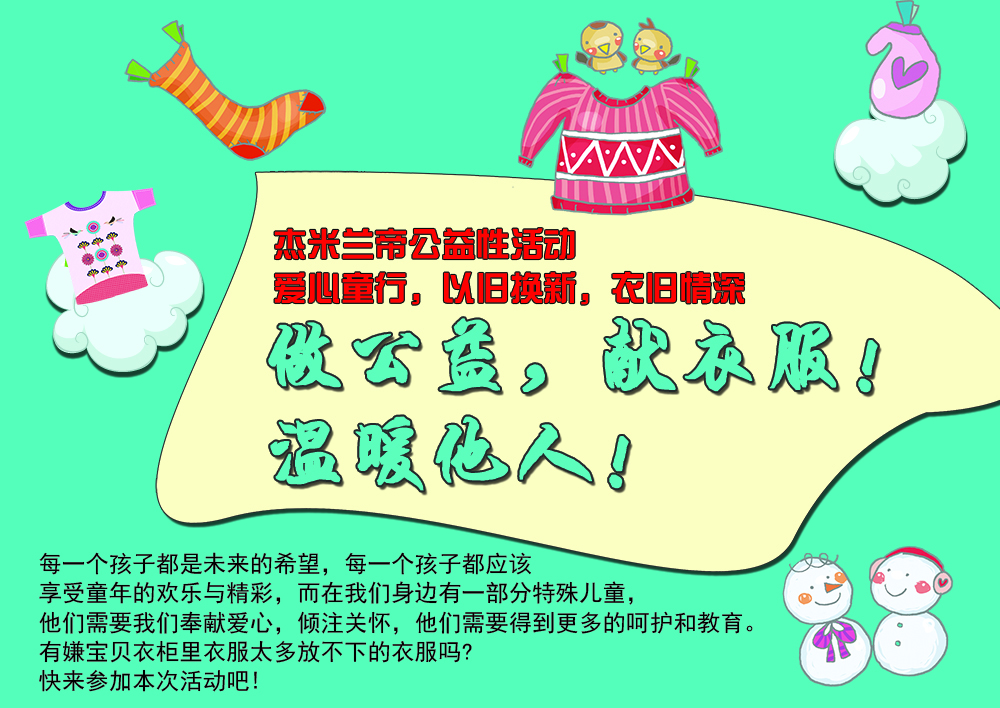 也許,柜子里那件躺了好久的衣服,您已經忘了它的存在,但是您可知有一群孩子急需它!請將它交給我們,我們將您的愛傳遞,讓這個社會更加溫暖……