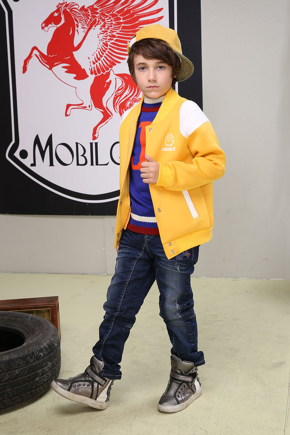 黃色棒球衫+牛仔長褲