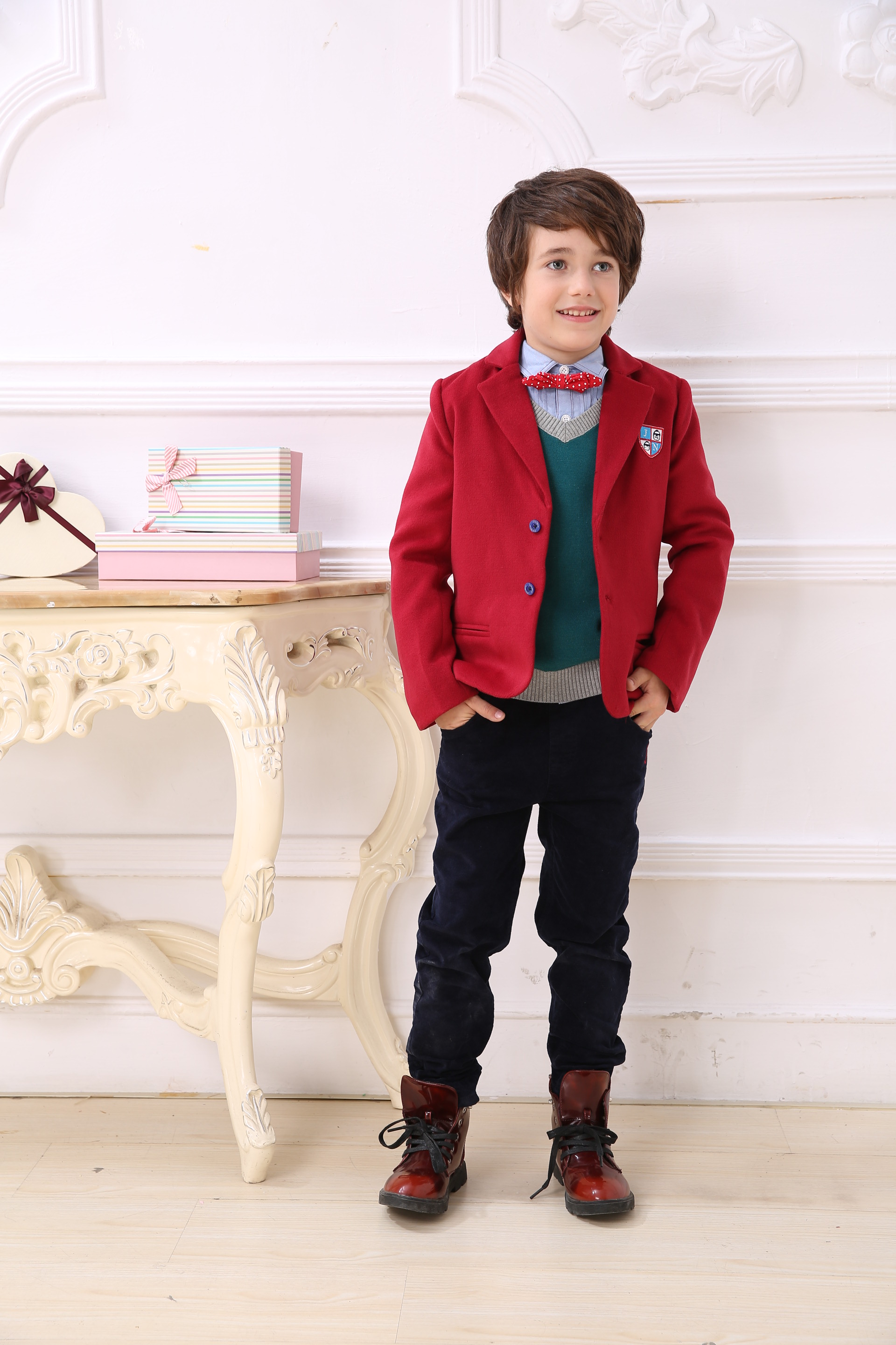 男童裝也走全紅——高領(lǐng)黑衫配亮色翻領(lǐng)全套紅西裝,帥氣時(shí)髦,喜慶永不過時(shí)。