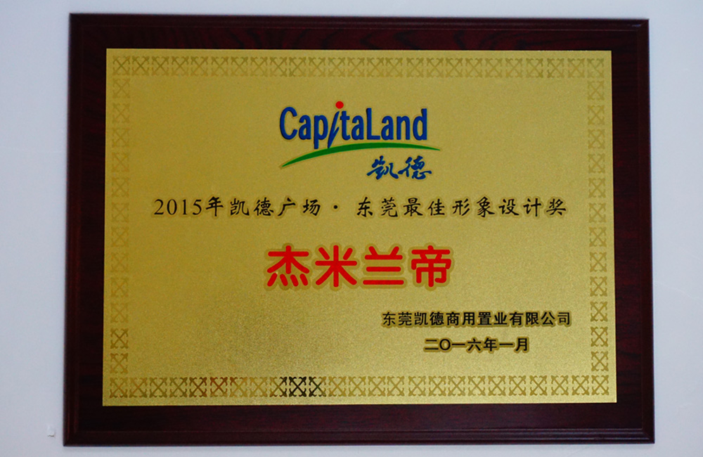 2015年尾杰米蘭帝品牌參加東莞凱德廣場的店鋪設計獎,不管是對店鋪的設計和產品的研發杰米蘭帝都在高度的重視著。2016年1月25日,杰米蘭帝的店面經過評審會審核,東莞凱德廣場公布了2016年度店鋪設計的獲獎名單,杰米蘭帝以生動有趣的店面設計獲得了凱德廣場2016年最佳形象設計獎,這是自杰米蘭帝成立以來第八次喜獲的佳獎。