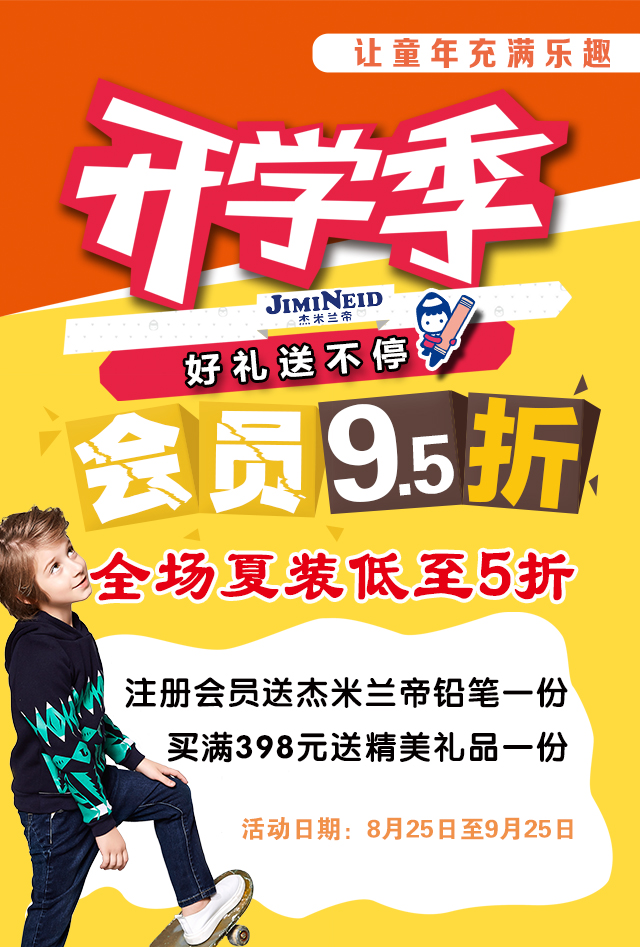 開學的腳步慢慢的靠近,新學期小盆友當然少不了美美的新衣服哦!杰米蘭帝是衣櫥的必備神器,是返校裝備購置的圣地。海量新品等你淘、更多選擇、更多優惠、好禮送不停等你開啟!秋意漸濃,灑滿陽光的日子顯得更珍貴!小小少年,沐浴著陽光,在校園里健康快樂成長!每一個孩子的童年都和校園有著難以分割的一段情,校園生活與孩子們的生活息息相關。杰米蘭帝秉承讓孩子的童年充滿樂趣的宗旨,讓孩子在學習與生活中都充滿樂趣!