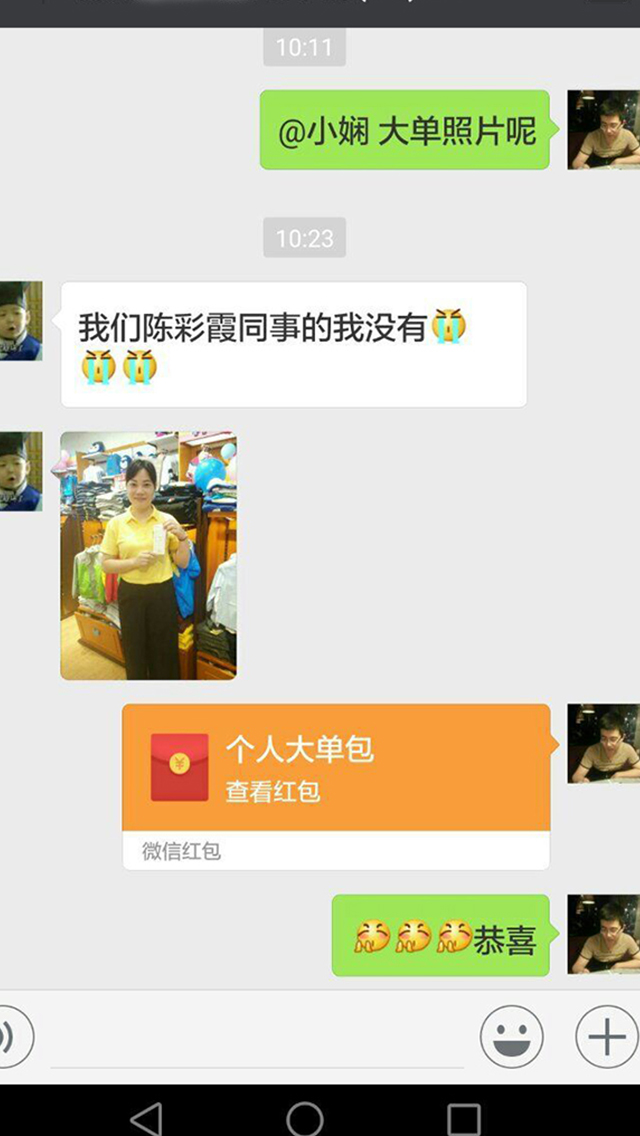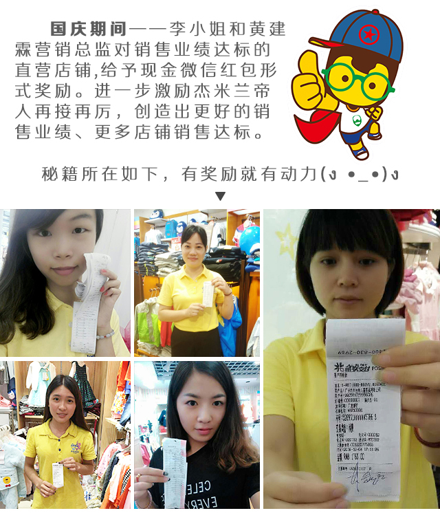 一、銷售奇跡背后,誰是幕后英雄?離不開杰米蘭帝家人的辛苦付出,面對一天滾滾人流,秋冬銷售搶購浪潮,前端導(dǎo)購以一對三,一對四,快速準(zhǔn)確搭配,精準(zhǔn)服務(wù)VIP,也常常因為太忙,顧不上吃飯,加班加點不停不歇,甚至開啟VIP送貨上門等服務(wù)。他們用激情和汗水辛苦鑄就的前端銷售奇跡,我們不會忘記。與此同時,李小姐和黃建霖營銷總監(jiān)給予達成銷售業(yè)績的店鋪以現(xiàn)金微信紅包形式獎勵和店員更多的福利獎勵,關(guān)愛員工成長是公司的一貫立場。在此,對她們在國慶期間的銷售工作中所付出的努力表示感謝。