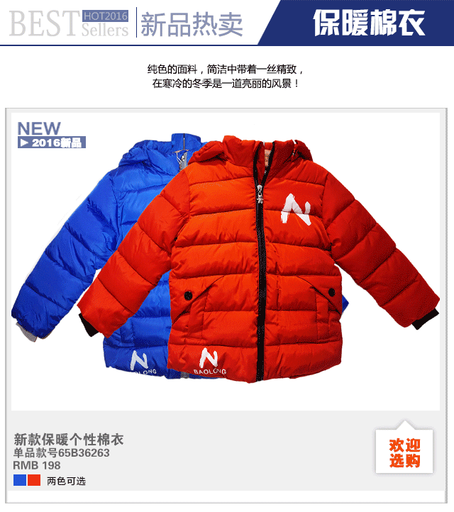 新穎的款式、舒適的面料、飽滿的填棉量、輕盈又溫暖、時尚且高檔,使它成為了寶寶們冬季里的最愛。我們采用高質量的填充物,進行高含量的填充,給寶寶們絕對的溫暖保證。冬日里怎么可少了它的呵護?