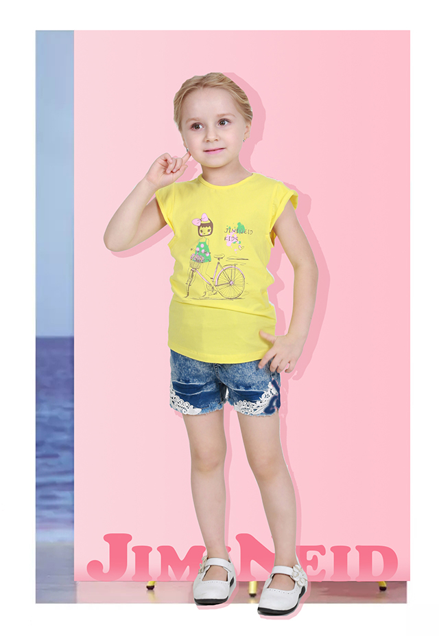 白色圓領T恤以及藍色梭織短褲配以卡通圖案,簡潔不乏時尚潮流。